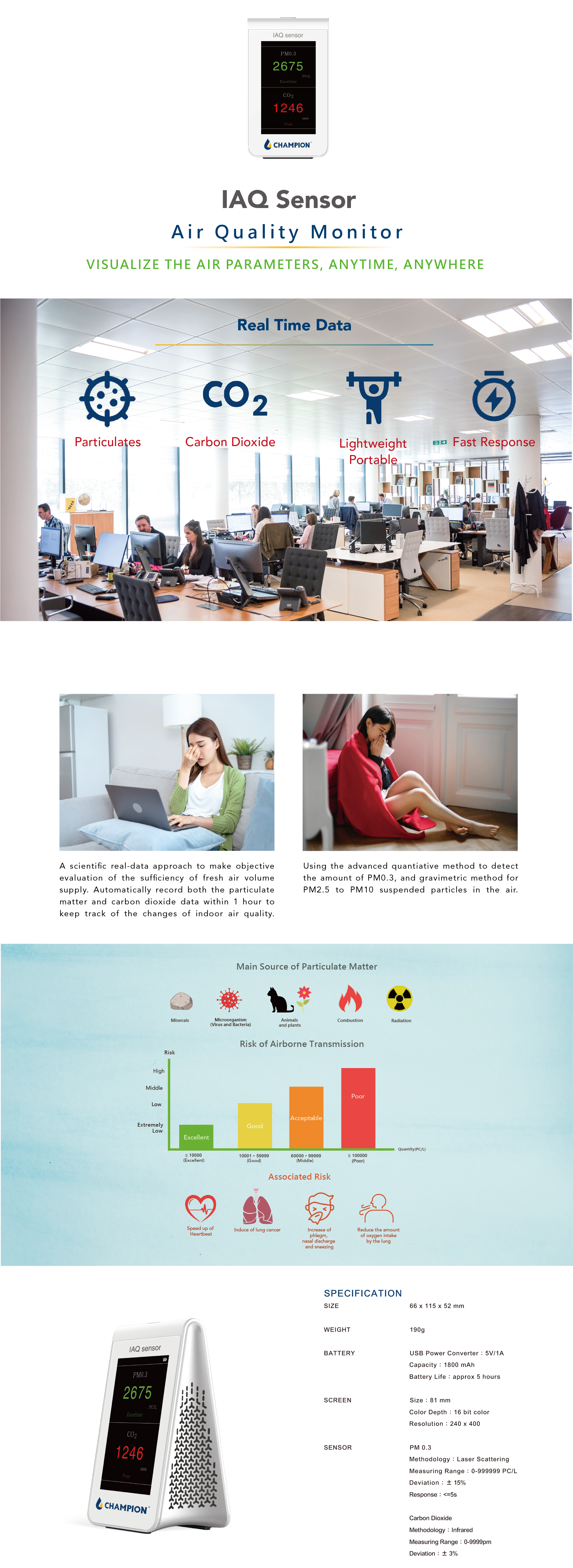 CHAMPION IAQ Sensor – An air quality monitor which detects PM0.3 suspended particles and concentration of carbon dioxide in real time. Its sensitivity is higher than other device found, visualizing the air quality parameters anytime, anywhere.